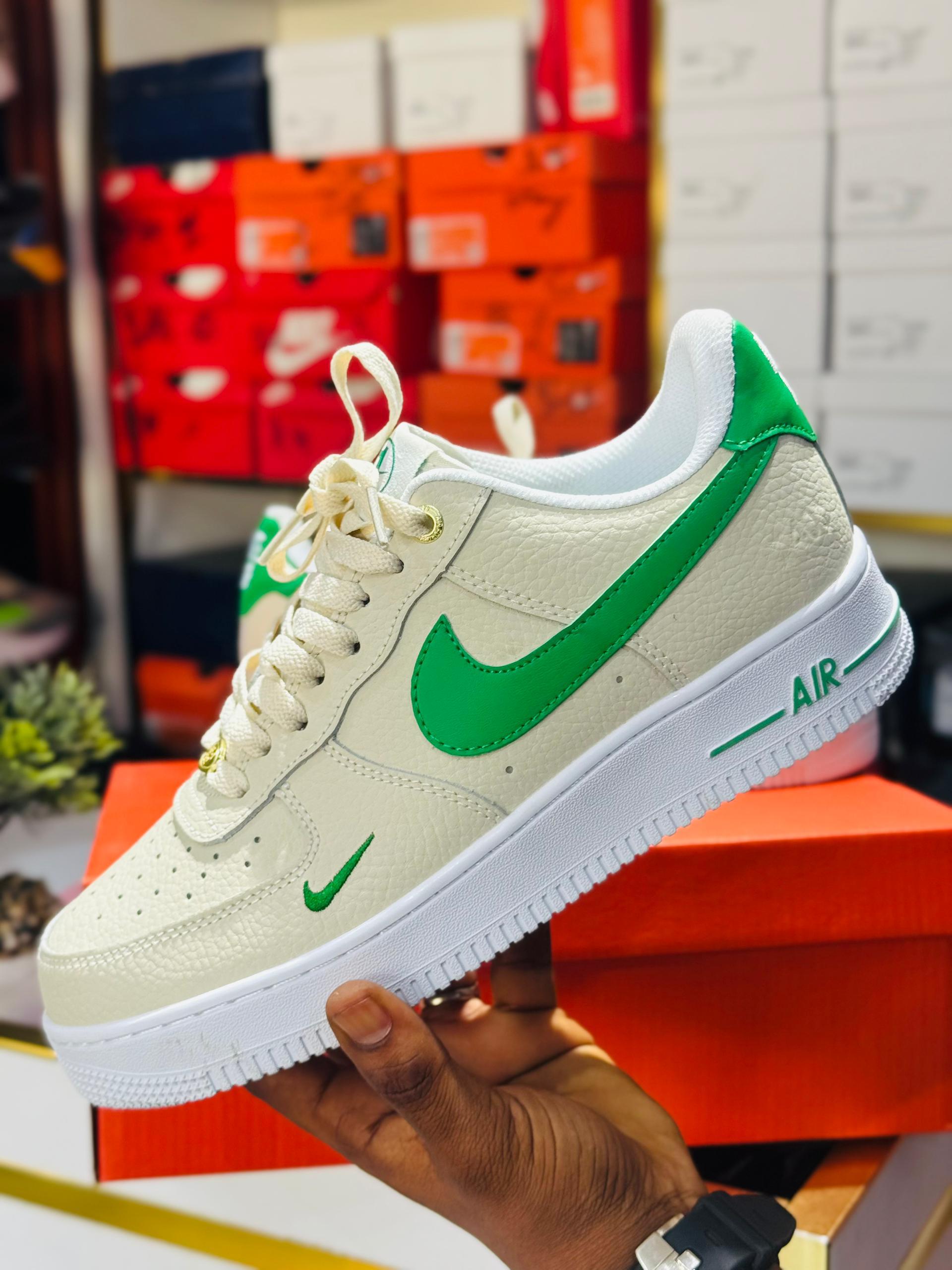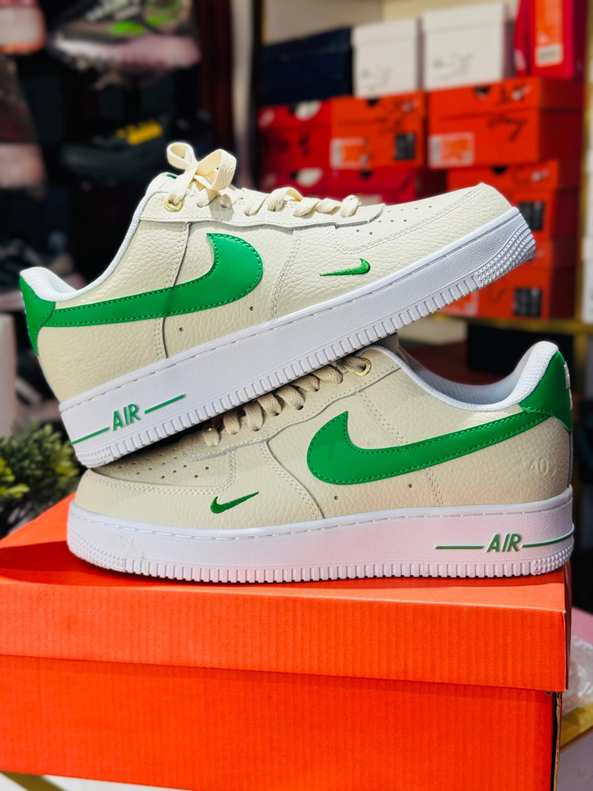 - Nike Air Force 1 "Cream & Green" : Ce modèle se distingue par sa base crème et ses accents verts vifs, créant une esthétique fraîche et énergique. Le logo Swoosh en relief et le détail "AIR" sur la semelle font de cette sneaker une pièce maîtresse pour un look décontracté et tendance.